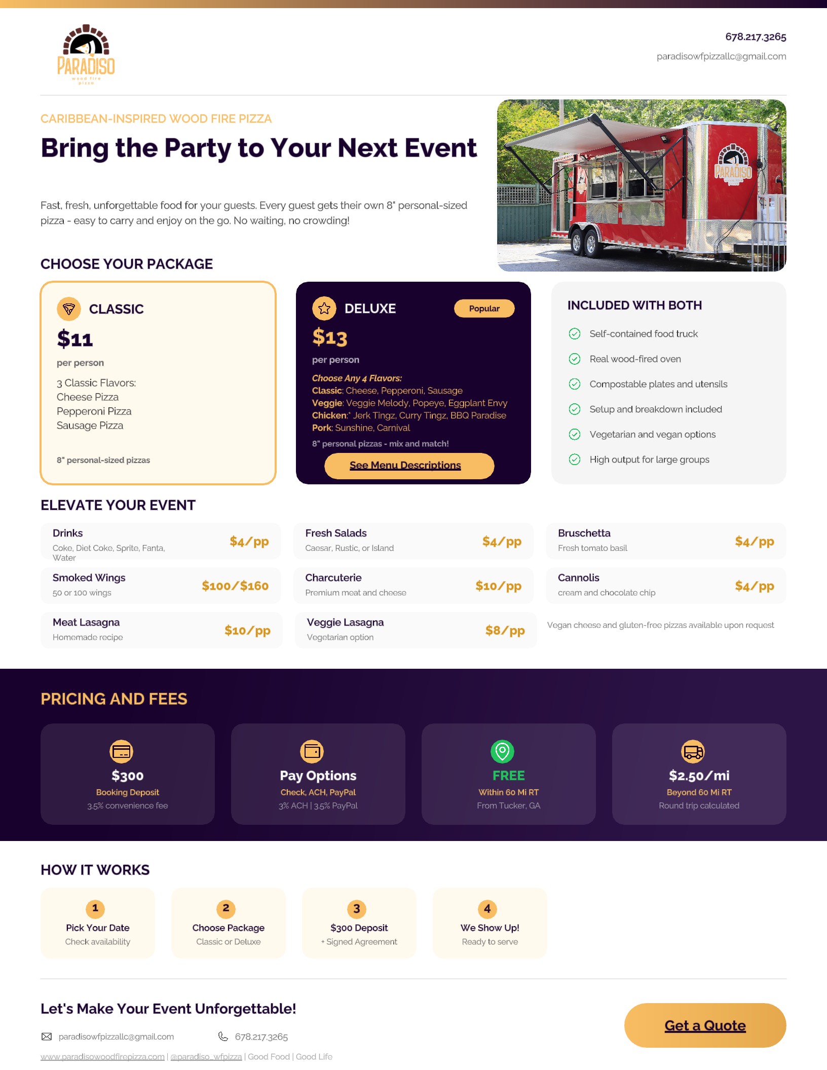 In the unlikely event that we must cancel your reservation due to circumstances beyond our control, such as a death, mechanical issues with the truck, or an accident, please rest assured that you will receive a full refund, including your deposit. Additionally, we extend the option to reschedule your event at no extra charge. Your understanding and cooperation in such unforeseen situations are greatly appreciated.