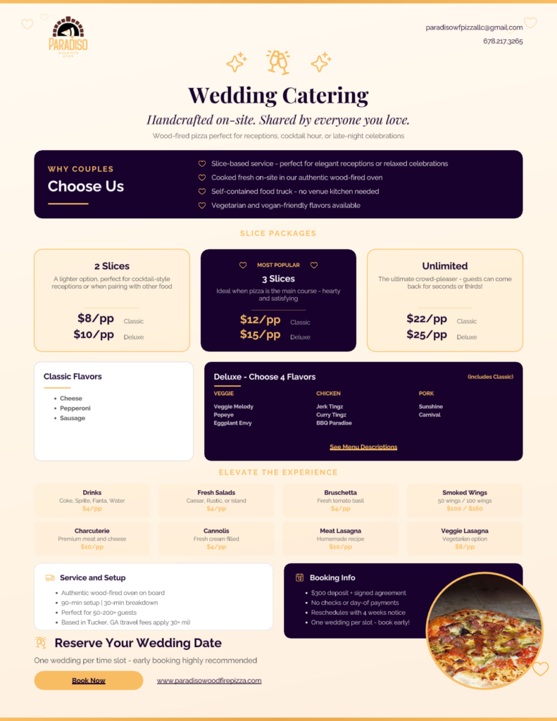 - You can choose to serve buffet style (as many slices as they can eat $10/guest upcharge).